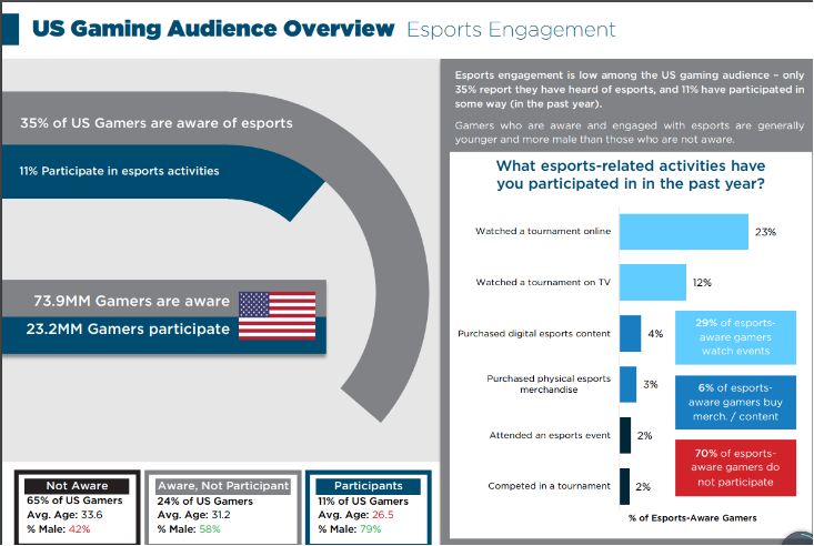 报告指出,在电子竞技方面,35%的美国玩家知道“电竞”,但参与电竞活动的玩家占比仅为11%。在参与电竞活动的玩家中,平均年龄为26.5岁,且79%都是男性玩家。