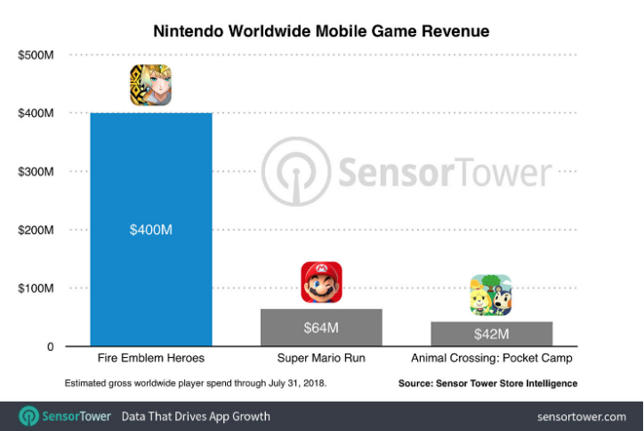 截至目前,在手游领域,任天堂旗下最挣钱的游戏依旧是《火焰之纹章:英雄》。该作是一款遵循了主流市场免费下载、道具付费的策略角色扮演游戏。据市场研究机构SensorTower预测,自2017年2月至今,任天堂旗下热门手游《火焰纹章:英雄》已经推出了一年半之久,其在App Store和Google Play两大商店的全球累计营收也已经突破了4亿美元大关。而这款游戏在发布一周年的时候,就已经达成了年收入近3亿美元的里程碑。这也意味着,在短短半年的时间里,《火焰纹章:英雄》这款手游的热度依旧不减,为任天堂手游业务贡献了1亿美元的营收。