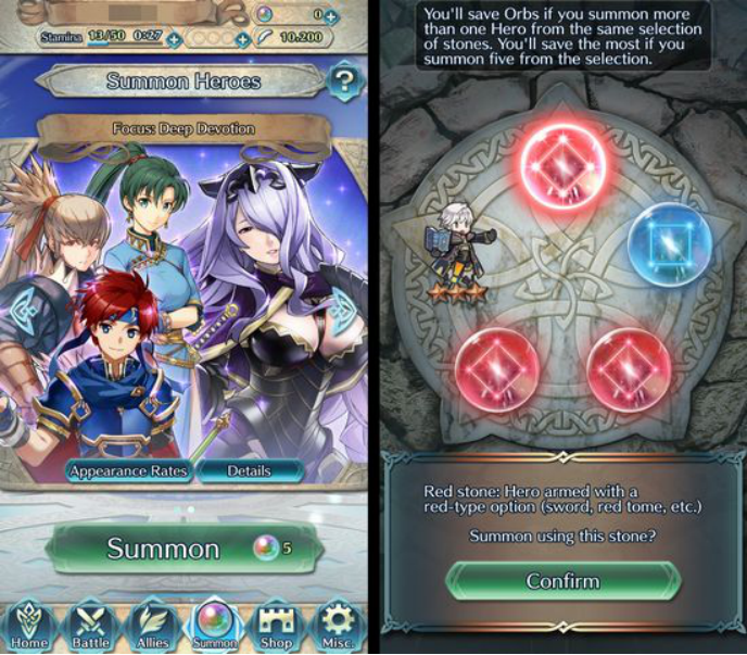 “扭蛋”被誉为一种珍贵的暗黑艺术,是日本游戏从业者常用的盈利手段。它的基本概念是,让玩家在不知道购买内容的前提下氪金。与大部分手游一样,在《火焰之纹章:英雄》中,任天堂加入了“扭蛋”系统,玩家可以通过对战或购买获得游戏中的光珠(orbs,游戏中的一种道具)。它们主要用于解锁游戏角色,但是玩家预先并不知道自己会抽中怎样的英雄。既有可能得到新英雄,也有可能抽到无用的重复角色。值得一提的是,这也是任天堂在手游上首次尝试“扭蛋”系统。