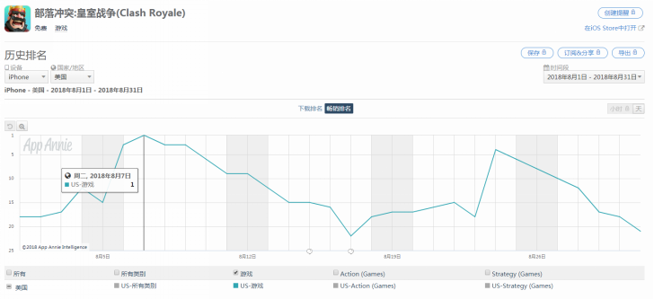 根据AppAnnie的数据,在整个8月,《皇室战争》在美国App Store畅销榜上的排名基本在TOP20以内。值得一提的是,在8月7日,这款游戏的表现尤为亮眼,一举拿下了美国畅销榜冠军。