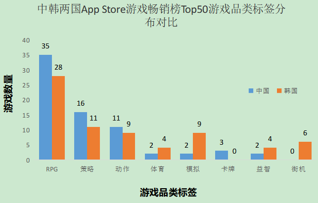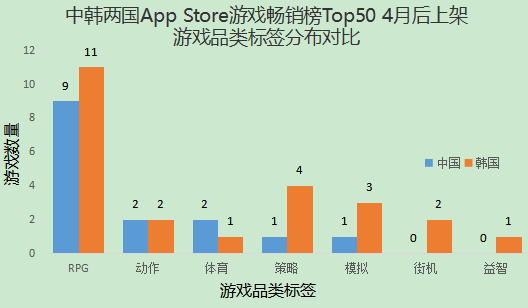从品类上看,上榜的50个游戏中带RPG标签的游戏有35个,带策略类标签的有16个,带动作类标签的有11个,带模拟类,体育类和益智类标签的各有2个,带卡牌类标签的有3个。而在同一时间,我们以同样发达的韩国市场作为参考,发现韩国App Store游戏畅销榜Top 50的品类分布明显更均匀:虽然带RPG标签的游戏也是占了多数,有28个,但是带其他品类标签的游戏数量也不少:带策略类标签的有11个,带模拟类和动作类标签的各有9个,带街机类标签的有6个,带益智类,体育类标签的各有4个。