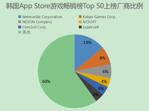 而且韩国市场在厂商分布格局上也均匀很多,上榜游戏最多的厂商是Netmarble Corporation,有7款游戏上榜,紧随其后的是有4款游戏上榜的Kakao Games Corp.,之后是有3款游戏上榜的NEXON Company,然后还有2款游戏上榜的NCSOFT、Com2uS Corp.、Supercell 3家厂商,只有一款游戏上榜厂商的比例是高达60%,而这个数据在中国只有34%,相差近一倍。比起中国的腾讯一枝独秀,韩国反而是百花齐放。