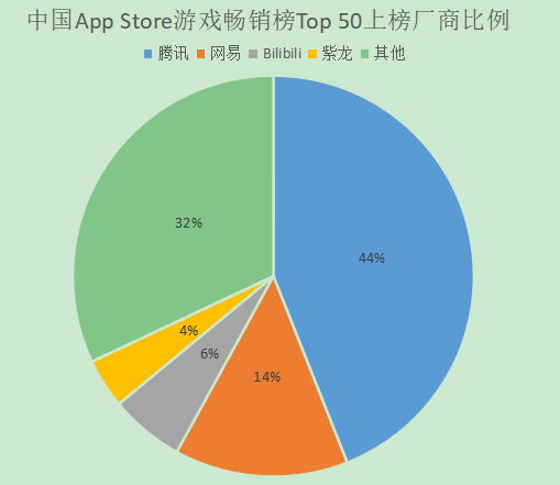 在中国的App Store游戏畅销榜Top 50名单上,我们看到了很多熟悉的面孔,隐约形成了以RPG,策略和动作为“头”,其他品类为“脚”这样的一个“头重脚轻”的现象。而在厂商分布上也出现了高度集中的情况,腾讯、网易两个一线大厂大有合力垄断市场之势,单是这两家厂商就占据了榜单近60%的份额。