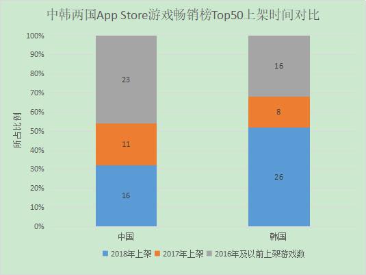而且就算在有新鲜感加成的情况下,国服的榜单上今年4月后新上游戏的比例还是偏低,只有22%;反观韩服的比例有30%,相差了近10%;这个对比如果放到“今年新上架的游戏”上就更明显了:国服今年新上架游戏上榜比例只有32%,而韩服是52%,差距达到了20%,在版号问题还未落实之前,这个差距可能还会继续扩大。