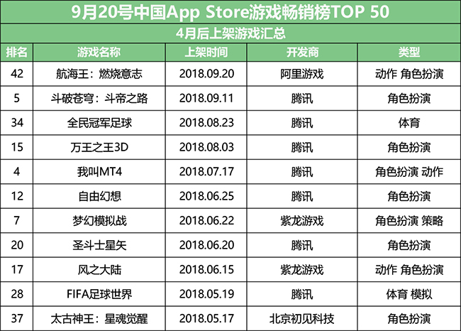 只看数据层面的话,国服App Store的游戏畅销榜前50中有11个是在今年4月后才上架的,这数字一看还可以。但其实在这11个游戏中,绝大部分都并不能称为“新游戏”,例如在6月上架的《自由幻想》,它背后其实是个已经十多岁的老端游;最新上架的《航海王:燃烧意志》,同样也是个有着多年历史的经典IP。而且可以在下图中看出,这些新上榜游戏的品类还是以RPG和动作类为主。