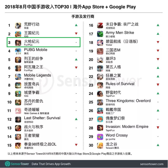 毋庸置疑,FunPlus在SLG领域一直都做得很不错,旗下SLG游戏《阿瓦隆之王》常居中国手游出海收入榜TOP3,而另一款SLG手游《火枪纪元》亦不负众望、表现持续坚挺。在8月,该作依旧排在中国手游出海收入榜TOP3。得益于旗下《阿瓦隆之王》以及《火枪纪元》的出色表现,FunPlus拿下了8月中国App发行商出海收入榜亚军的位置。