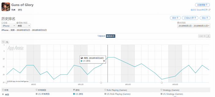 而在海外最重要的其中市场美国,《火枪纪元》亦交出了不错的成绩单。根据AppAnnie数据显示,在整个8月,《火枪纪元》在美国App Store畅销榜的排名基本介于TOP10-TOP20之间,成绩可谓相当亮眼。由此可见,国产SLG手游在美国市场依然很吃香。