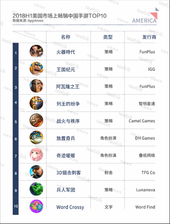 根据Teebik数据,在2018年上半年,美国市场上畅销的中国手游前三甲分别为《火枪纪元》《王国纪元》以及《阿瓦隆之王》。值得一提的是,这三款游戏均为策略类游戏,其中《火枪纪元》《阿瓦隆之王》均出自FunPlus旗下。得益于《阿瓦隆之王》、《火枪纪元》的强劲表现,老牌厂商FunPlus依旧稳坐上半年出海冠军宝座。此外,TOP10中共计6款都为策略游戏,中国策略在美国市场的需求可窥一斑。