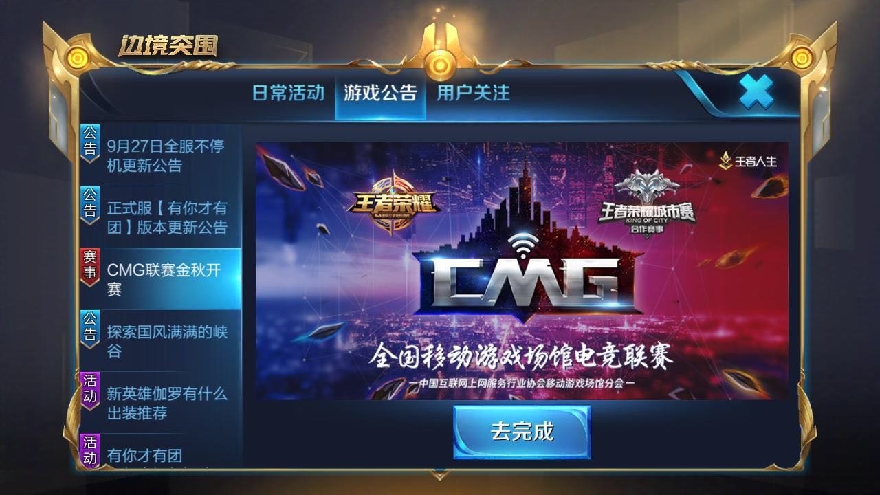 中国互联网上网服务行业协会移动游戏场馆分会主办的2018CMG全国移动游戏场馆电竞联赛(以下简称联赛)于9月下旬启动,10月正式开赛。本次赛事将覆盖北京、上海、广东、天津、河南、河北、山东、山西、浙江、安徽、江苏、湖南、湖北、黑龙江、吉林、宁夏、江西、福建等18个省区;线下赛点通过前期线上报名及赛事组委会的严格筛选,落地到魔杰电竞、白夜电竞、Buff手游馆、联盟电竞、FUN肆玩吧等40余家专业移动电竞场馆进行比赛。本次联赛以王者荣耀为比赛项目,采用5v5王者峡谷对战模式,晋级成功的全国冠、亚军队伍将获得第六届王者荣耀城市赛大众场分站赛资格。