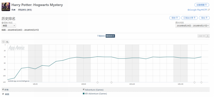 在美国市场站稳脚跟之后,Jam City又将目标瞄准亚洲市场。得益于“哈利波特”这一全球知名IP,Jam City将《哈利波特:霍格沃茨之谜》打入亚洲、韩国市场并非难事。此外,在本地化方面,为迎合亚洲玩家的需求,该作顺势推出了韩文和简体中文版。在最近的30天内,该作在韩国市场的表现呈上升、稳定趋势。根据AppAnnie数据,《哈利波特:霍格沃茨之谜》基本徘徊在韩国Google Play畅销榜TOP40。
