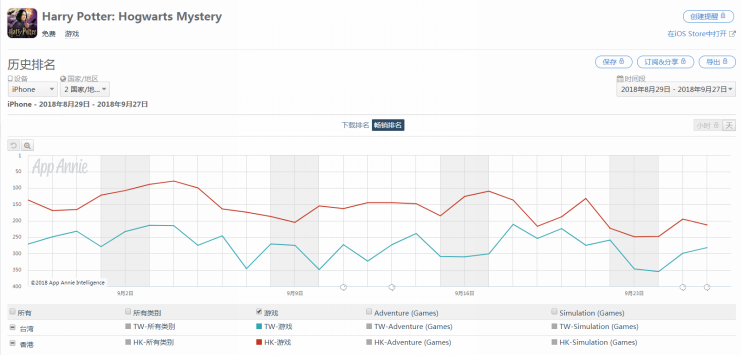 与韩国市场相比,香港和台湾市场的成绩要稍显逊色。根据AppAnnie数据,《哈利波特:霍格沃茨之谜》基本徘徊在香港App Store畅销榜TOP100-TOP200。而台湾市场的表现更为不尽如人意,仅排在台湾App Store畅销榜TOP200-TOP350。
