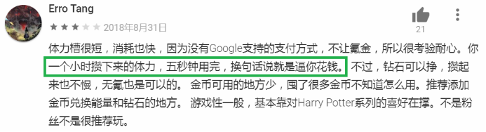 虽然凭借哈利波特的高知名度,玩家对于剧情充满无限期待。但游戏中的体力值设计却遭到了不少玩家吐槽。在游戏中,玩家在推剧情、或是进行魔法等操作时都会消耗体力值。和大部分游戏一样,虽然体力值可随时间恢复,但“充电两小时,游戏五分钟”的尴尬局面在游戏中、后期仍然时常发生——原因是体力值消耗的速度实在是太快了。除了等待体力恢复,另一个可快速恢复体力值的方式便是充值购买了,但这未免会让玩家觉得“坑钱”的意味太明显了点。