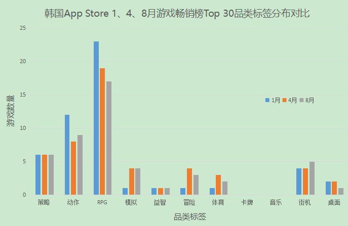 通过榜单数据的对比不难发现,韩国玩家似乎在这半年多的时间里口味发生了转变:带动作类和RPG类两个标签的游戏虽然仍占多数但数量显著减少;带有模拟类,冒险类和体育类标签的游戏虽然明显增多了,但总体占比依旧还是敌不过RPG类和动作类;益智类,策略类和街机类的表现最平稳;而在美国、日本市场未见踪影的桌面类在韩国地区似乎还颇受玩家青睐,但在上个月的表现也有所下滑。在韩国市场的主要上榜游戏品类中,RPG类和动作类均出现了下滑,而模拟类,冒险类和体育类则是有所上升。