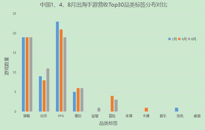 相比下,中国在同一时间的出海手游Top 30的榜单中,品类分布和韩国市场重合度还是挺高的。同样以策略,动作和RPG三大类为主,而且模拟类和冒险类也在上升,虽然中国出海手游在品类上不如韩国市场那么丰富,但总体来说两个市场的共通点还是挺多的。