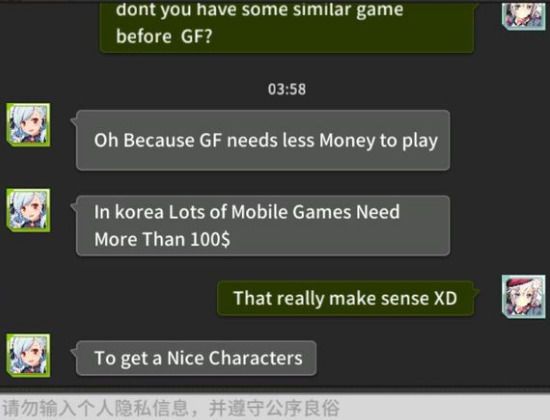少女前线中韩两国玩家对话,据韩国玩家反映,这个游戏的氛围要轻松舒服得多