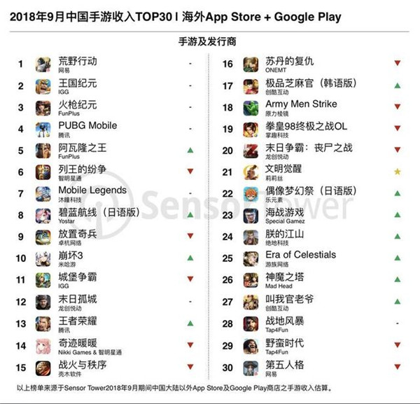 根据Sensor Tower发布的9月中国手游收入TOP30的数据来看,FunPlus旗下的《火枪纪元》和《阿瓦隆之王》分别占据了第三位和第四位,值得注意的是,自2018年以来,这两款产品就没有跌过手游出海收入榜前五位。