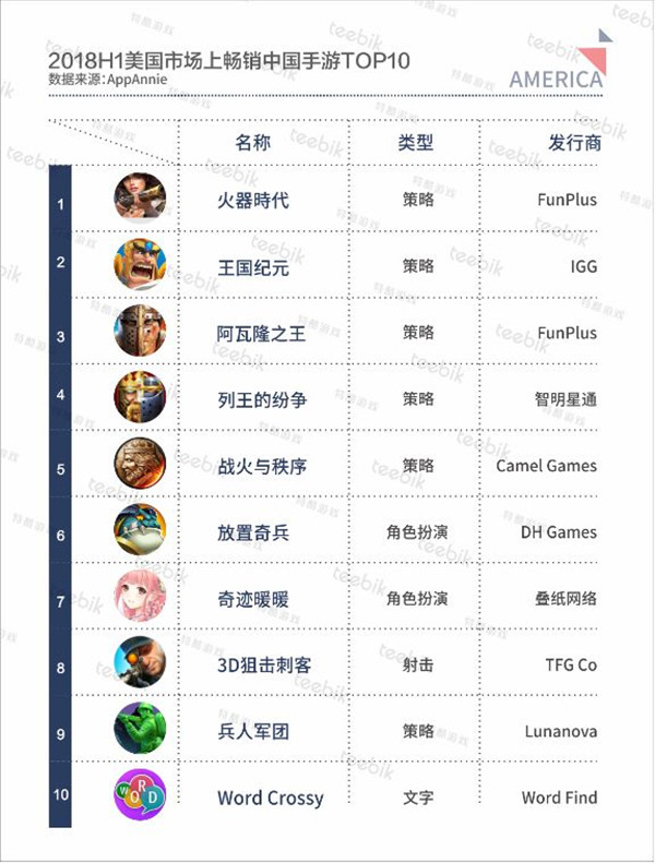 根据Teebik数据显示,在2018年上半年,美国市场上畅销的中国手游前三甲分别为《火枪纪元》、《王国纪元》和《阿瓦隆之王》。这三款游戏均为SLG类游戏,此外,榜单TOP10中共计6款都为SLG游戏,由此可见,中国SLG类游戏在美最受欢迎。