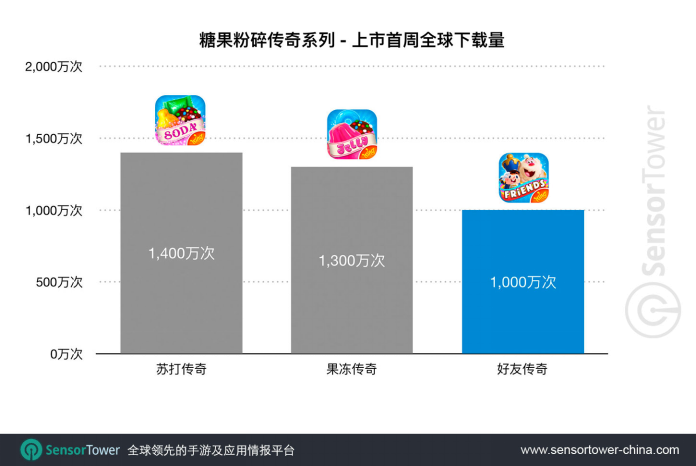 得益于糖果粉碎系列这一知名IP,《好友传奇》开局表现良好。10月13日,该作拿下了App Store36个国家及Google Play22个国家的所有应用下载榜TOP1。在游戏发布的第一周,这款游戏在全球App Store及Google Play的总下载次数达到了1000万。相比之下,《苏打传奇》和《果冻传奇》的表现更加出色,发布首周下载次数分别达到了1400万和1300万。