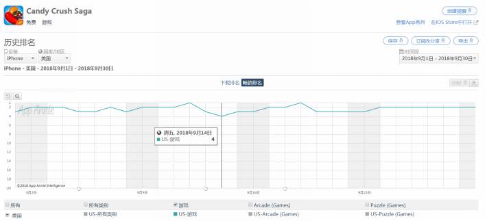 根据App Annie数据,9月份,糖果系列原作《糖果粉碎传奇》的营收表现依然十分强劲。在整个9月,该作一直排在美国App Store畅销TOP4以内。