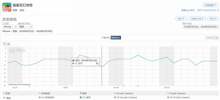 9月《糖果苏打传奇》美国App Store畅销排名趋势