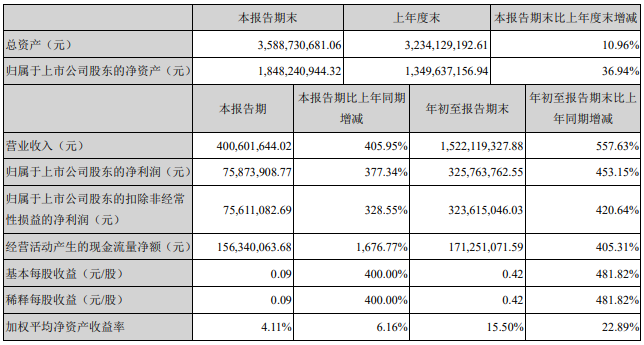 报告显示,该公司第三季度营收约4.01亿元,同比增长405.95%;净利润约0.76亿元,同比增长377.34%。