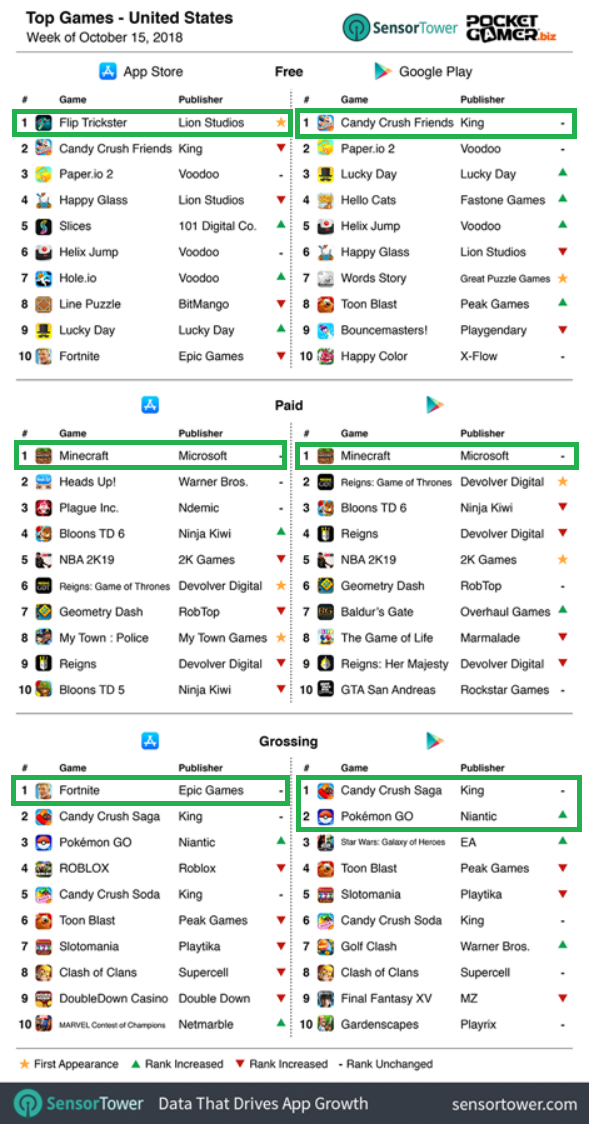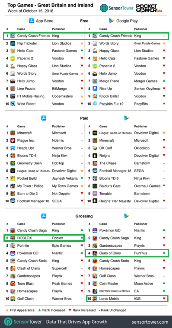 在英国及爱尔兰免费榜,King出品的《糖果好友传奇》成为了最大赢家,力克Lion Studios旗下的《Flip Trickster》,一举拿下App Store及Google Play两大平台的冠军宝座。