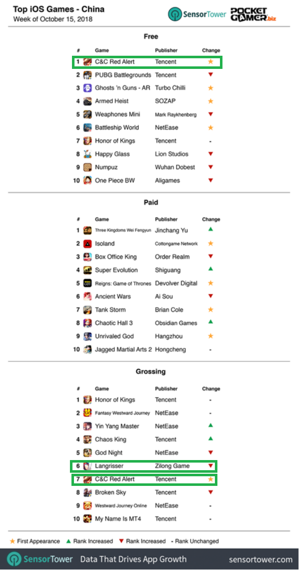 中国榜单:《红警OL手游》拿下免费第1、畅销第7