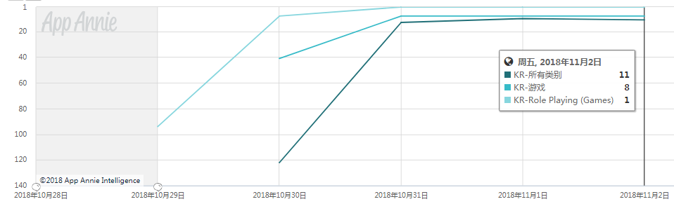《猎魂觉醒》在韩国Google Play市场游戏免费榜的排名一路上升,之后一直稳定在Top10之内