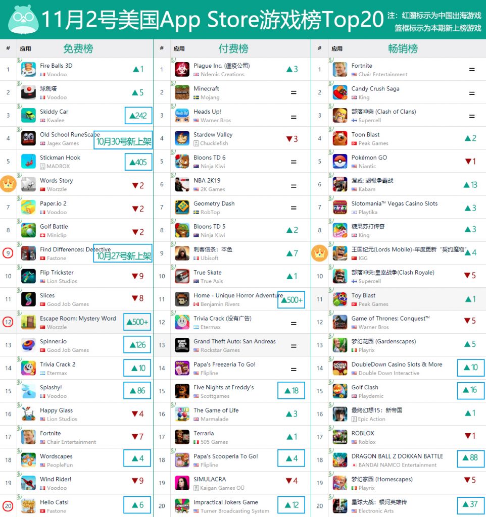 而本期上榜美国畅销榜Top20的游戏大多都是和上期榜单一致,看来最近美国市场在总体上还是比较稳定的,只是中国出海游戏的表现并没有之前的出色,看来出海美国的各个厂商要加把劲了。