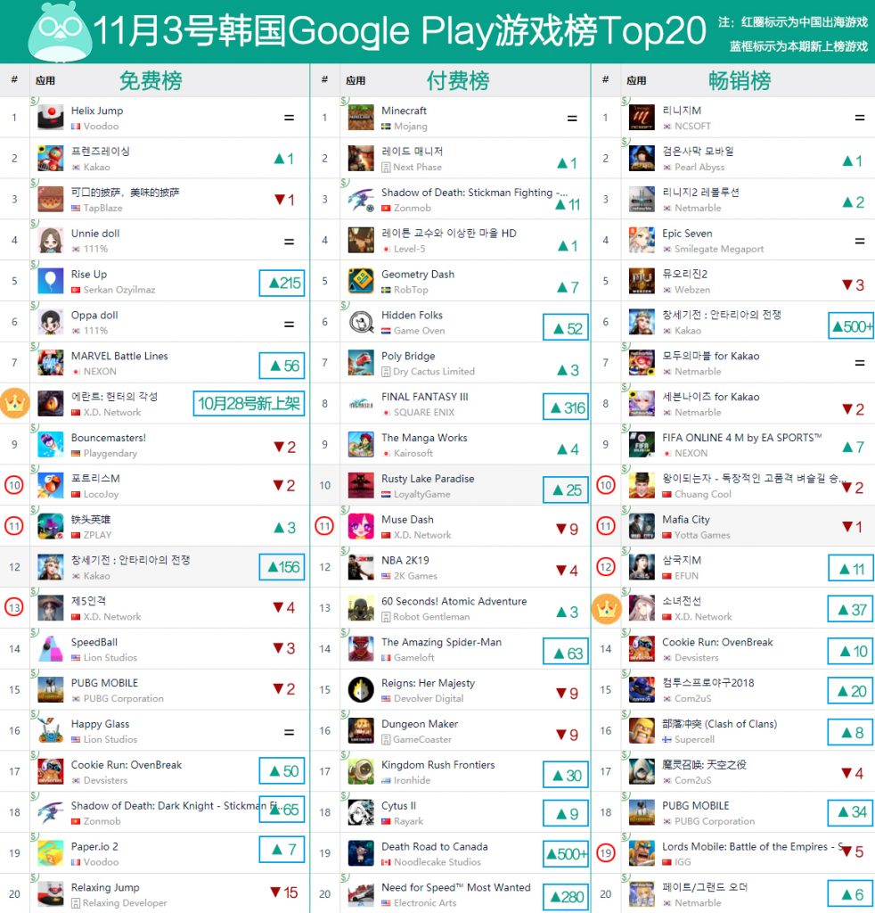 还是先从韩国市场开始:(由于韩国市场的手机平台构成极不平衡,所以我们取用的数据是在当地占据绝对优势的Google Play市场数据。)