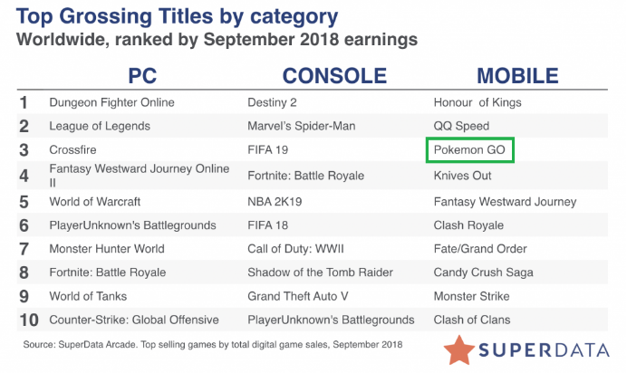 得益于交易系统的更新,以及夏季户外捕捉小精灵热潮的兴起,该作再次迎来了新的高峰期。根据Super Data数据,在今年夏季,《精灵宝可梦Go》已经连续四个月(6-9月)排在了全球手游畅销TOP3,仅次于《王者荣耀》和《QQ飞车手游》。