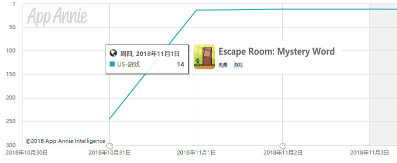 《Escape Room:Mystery Word》是Worzzle旗下的另一款休闲解谜类游戏,游戏把密室逃脱和填字解谜两种玩法融合到一起。然后再配合着社交媒体上的买量投放,月初的时候游戏排名突然飙升到14位。