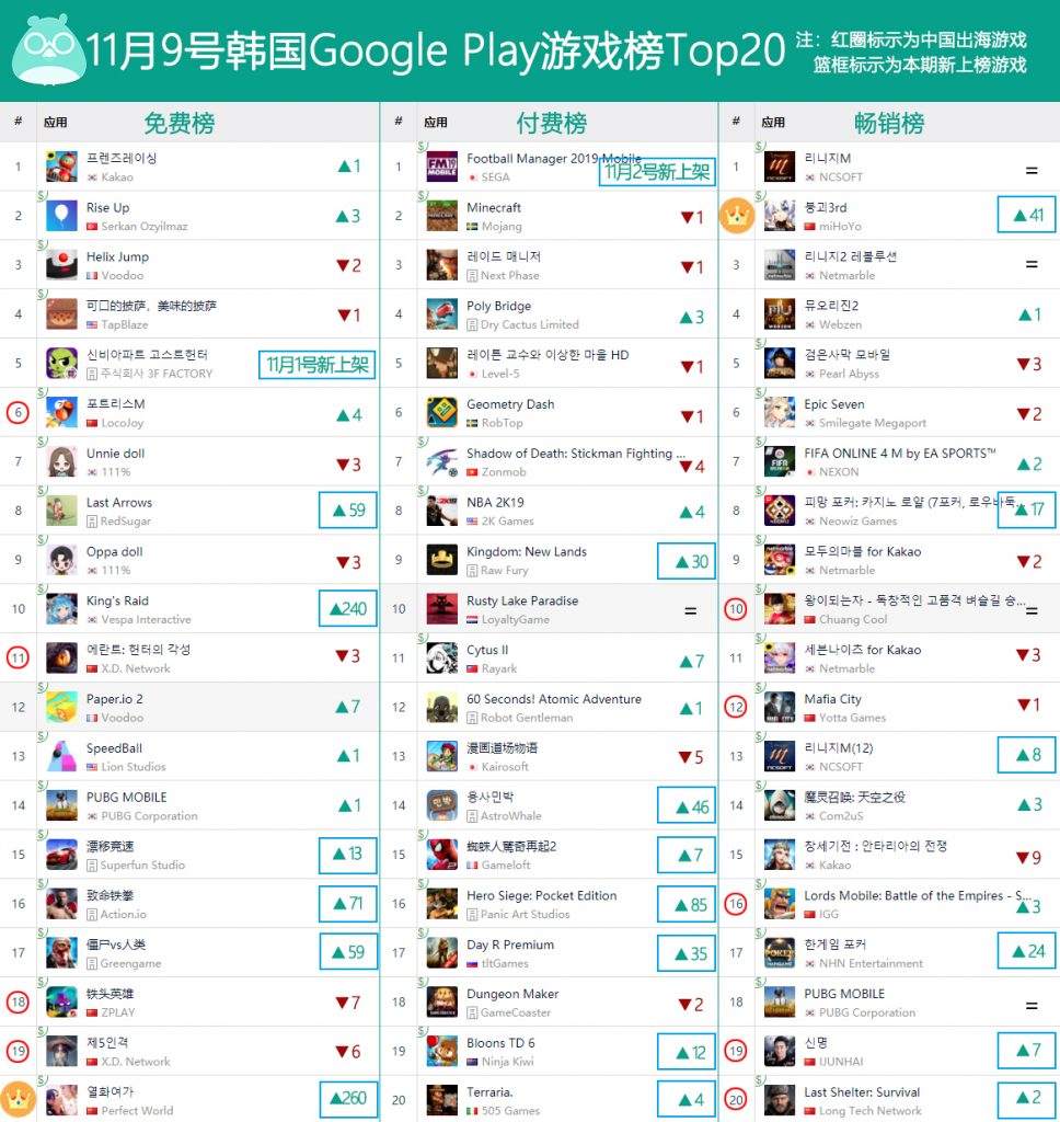 而畅销榜方面则是有:米哈游旗下的《崩坏3》,创酷的畅销榜常客《极品芝麻官》,Yotta Gmaes的《黑道风云》,IGG的《王国纪元》,新面孔有君海游戏的《神明》(신명)和龙创悦动的《末日孤城》。
