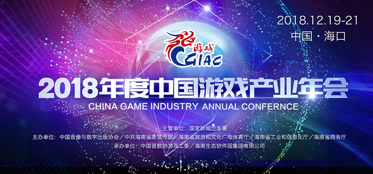 由国家新闻出版署主管,中国音像与数字出版协会、中共海南省委宣传部、海南省旅游和文化广电体育厅、海南省工业和信息化厅、海南省商务厅主办,中国音数协游戏工委与海南生态软件园集团有限公司承办的2018年度中国游戏产业年会定于12月19日至21日在海南省海口市举办。
