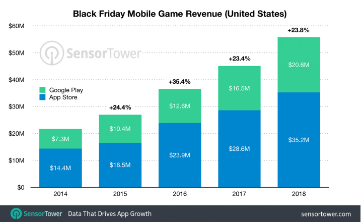 根据市场研究机构SensorTower的数据,在2018年黑色星期五当天(11月23日),美国App Store及Google Play两大商店上的手游营收共计达到了5580万美元,同比增幅为23.8%,并创下了美国市场历史上单日手游流水最高纪录。相比之下,2017年黑五当天美国手游营收为4510万美元,同比增幅为23.4%。