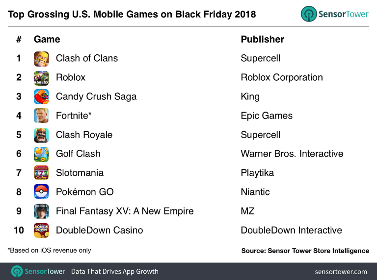 根据榜单信息,黑五当天美国手游畅销TOP10排名分别为:《部落冲突》《Roblox》《糖果传奇》《堡垒之夜》《皇室战争》《Golf Clash》《Slotomania》《精灵宝可梦Go》《最终幻想15:新帝国》《Double Down Casino》。