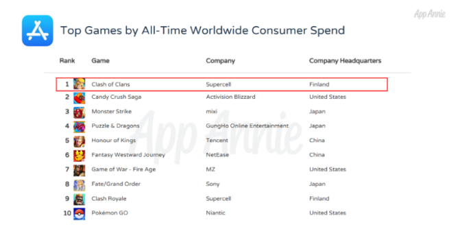 值得一提的是,根据SensorTower数据,截至今年十月,《部落冲突》在全球范围内的总营收已经超过了60亿美元。与此同时,根据AppAnnie发布的十周年应用数据,Supercell旗下的《部落冲突》成为了近十年来(2010年7月-2018年5月)全球营收最高的手机游戏。紧随其后的是《糖果粉碎传奇》、《怪物弹珠》、《智龙迷城》、《王者荣耀》。