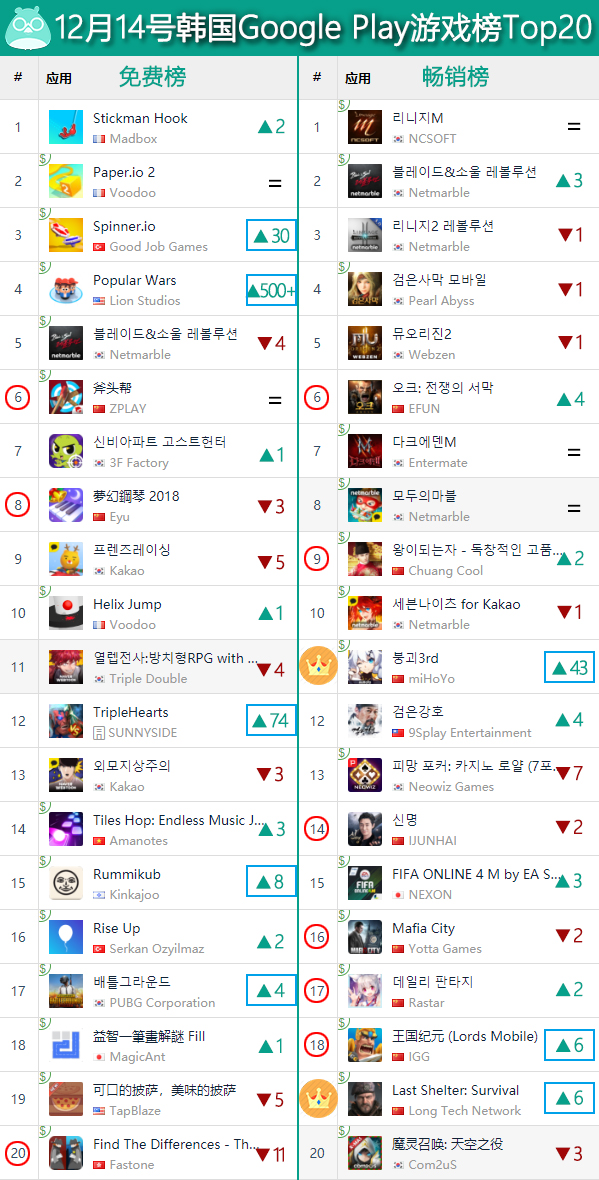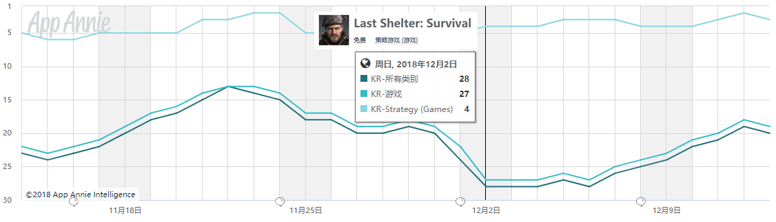 此外,11月出海表现相当出色的《崩坏3》也继续在韩国市场发力,冲上了11位,两款SLG《王国纪元》和《末世孤城》也在本期登上了Top20榜单。