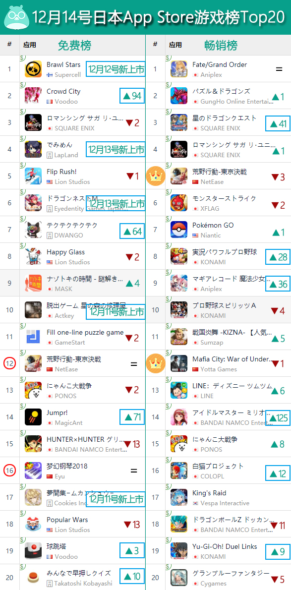 再来看看日本市场,本期在日本市场表现出色的中国出海游戏中并未有新面孔的出现,免费榜还是由《荒野行动-东京决战》和《梦幻钢琴2018》领衔。