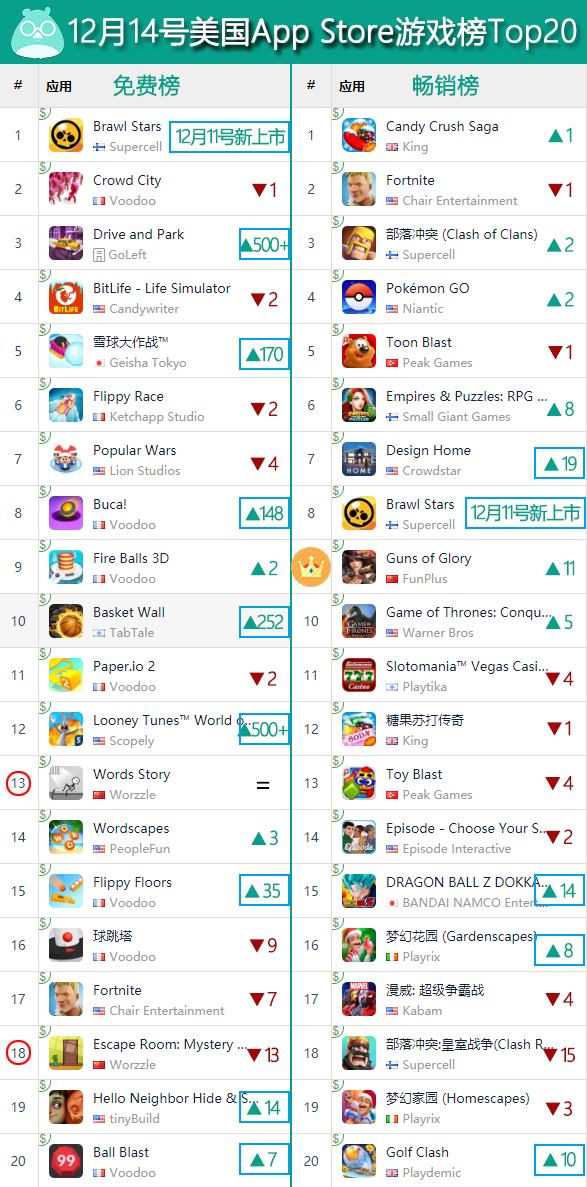 注:下列图表中红圈标示均为中国出海游戏,篮框标示均为本期新上榜游戏。
