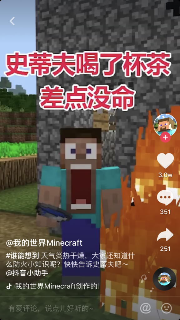 《我的世界》官方抖音产出了一批有针对性的内容,通过游戏内录的方式讲授了成语故事、课堂教学、生活小常识等教育向内容。且其讲述方式往往“百转千回”,让人猜不到结局。在一个讲述“杯水车薪”成语的视频中,史蒂夫在炎炎夏日遇上火灾,正在喝茶的史蒂夫用茶去灭火,结果火越烧越旺,以此幽默地表述“杯水车薪”的寓意,让用户在娱乐中接收、消化信息。寓教于乐的生动讲授使《我的世界》不仅收获用户的喜爱,更能收获持续的关注以及正面积极的好感度评价。