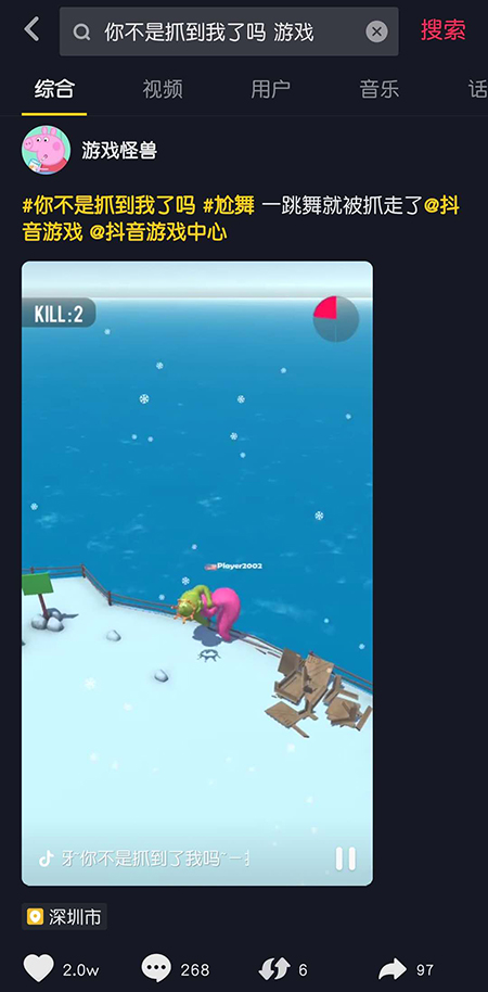之后网友们更是根据给游戏改了个非常贴地气的中文名:《你不是抓到我了吗》,病毒传播趋势进一步加剧。截至目前,在抖音平台通过检索游戏相关的关键字,在结果第一位的视频已经收获了超过2万个点赞和近300条评论,而视频的发布时间则是在昨天。