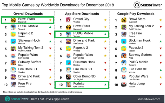 《荒野乱斗》12月全球下载第一,《PUBG Mobile》排名第二