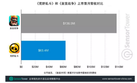 与此同时,SensorTower指出,该作上线首月在全球App Store及Google Play两大商店的总流水超过了6340万美元。作为对比,《皇室战争》首月全球吸金高达1.36亿美元,相当于《荒野乱斗》首月营收的2.15倍。(值得注意的是,为了更准确的对比两款游戏的营收表现,《皇室战争》中国地区iOS的营收数据并不包括在内。)