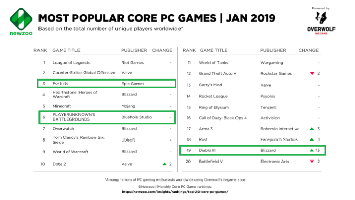 近日,市场研究机构Newzoo发布了2019年1月全球最受欢迎PC游戏榜单。榜单显示,“大逃杀”游戏依旧火爆,Epic Games旗下的《堡垒之夜》以及蓝洞出品的《绝地求生》分别排在榜单第3和第6。与此同时,1月榜单固化较为严重,排名TOP9游戏与上个月并没有任何变化,分别为《LOL》、《CS:GO》、《堡垒之夜》、《炉石传说》、《我的世界》、《绝地求生》、《守望先锋》、《彩虹六号:围攻》以及《魔兽世界》。