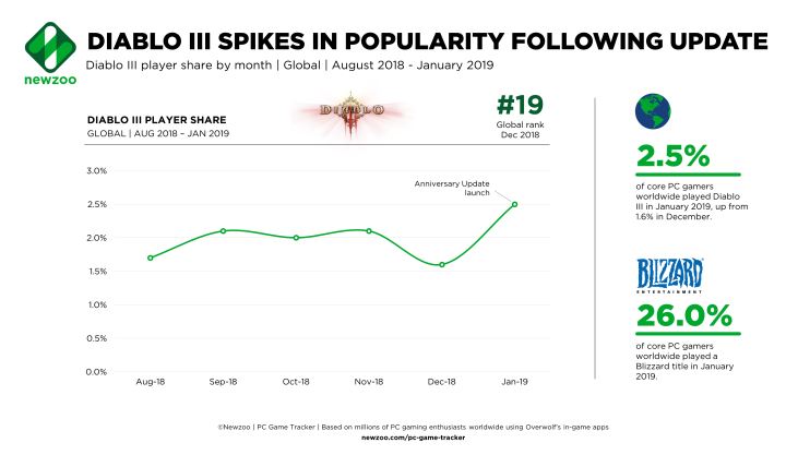尽管《暗黑3》推出已经将近长达7年时间,但是上个月在推出了以“怀旧”为主题的内容更新之后,该作的活跃玩家人数迅速飙升。根据Newzoo数据,2019年1月,全球核心PC玩家中有2.5%玩过这款游戏,而2018年12月和2018年11月的这一比例分别为1.6%和2.1%。这也创下了去年夏天以来的最好成绩。2019年1月,暴雪推出了颇具“怀旧”气息的周年庆典活动,玩家可以在1月3日至31日期间参加游戏内特殊活动,探索与暗黑系列前作相似的剧情、音乐及地图。
