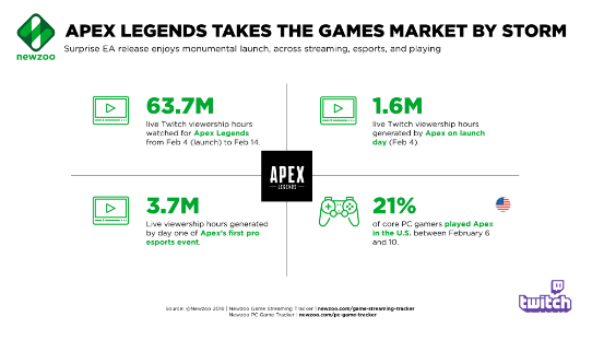 值得一提的是,Newzoo监测到EA出品的“吃鸡”新作《Apex英雄》在2月开局表现亮眼,预计下个月榜单会出现重大变更。