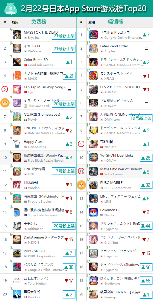 再来看看日本市场,本期的日本免费榜久违地迎来了新面孔:易幻旗下的《幻象回忆》,而在畅销榜方面,除了有《荒野行动》和《黑道风云》之外,另一款吃鸡游戏《PUBG MOBILE》本期在日本市场的表现也非常亮眼。