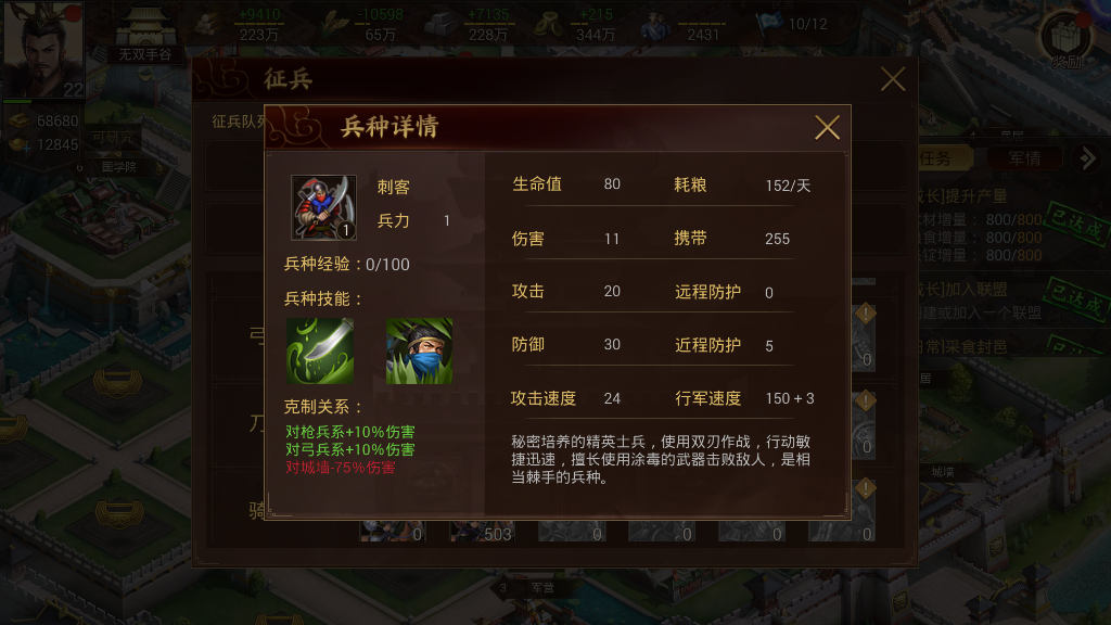我们以前期的特殊兵种刺客为例,刺客本身为刀兵,按照正常克制关系,刀兵本来应该无法克制骑兵,但是,属于刺客的两个技能,让该兵种产生了特殊的克制。刺客拥有的技能为潜行和毒击,潜行能够帮助刺客在远程回合规避伤害,毒击则能够使敌人中毒并且降低攻速,这两个技能的组合,让刺客拥有了克制骑兵的能力,通过阵容的搭配,我们完全可以利用刺客让敌人的骑兵陷入泥沼,从而在战场上扩大优势。