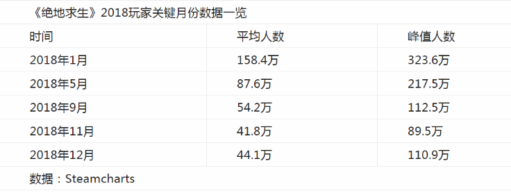 根据SteamCharts数据显示,在2018年11月份,《绝地求生》端游的峰值在线人数已经跌破百万大关、仅为89.5万,平均在线人数也仅有41.8万。对比2018年1月的323.6万的峰值在线人数和158.4万的平均在线人数,该作的峰值在线人数减少了234.1万,平均在线人数则减少了116.6万。